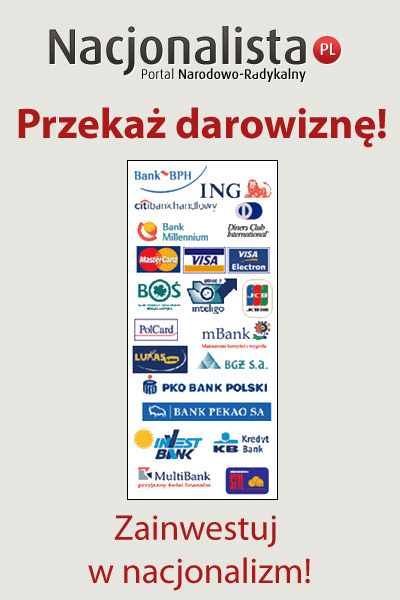 Pieniądze szczęścia nie dają, ale są nieodzownym elementem tworzenia rozbudowanych inicjatyw narodowych. Zwracamy się więc do naszych Czytelników o finansowe wsparcie, które pomoże nam utrzymać portal Nacjonalista.pl i projekty z nim powiązane. Wykonawcy strony i jej redaktorzy tworzą serwis nieodpłatnie, co oznacza, że za swoją pracę nie otrzymują wynagrodzenia. Portal tworzony jest społecznie – na zasadach non-profit. Wszystkie zebrane środki (z reklam, wpłat darczyńców) trafiają na działalność narodową, a każdy Wpłacający decyduje na jaki konkretny cel zostaną przeznaczone: