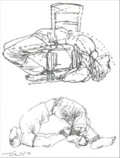 Większość naszych rozmówców donosiła, że w toku śledztwa byli skrępowani, podczas gdy przesłuchujący znęcali się nad nimi fizycznie. Szczególnie brutalną metodą jest tzw. „banan”, czyli sposób krępowania przyjęty w Strefie Gazy, jak również w większości ośrodków na Zachodnim Brzegu. Są dwie metody określane tym mianem. Jedna polega na przywiązaniu nóg podejrzanego do przednich nóg taboretu, a następnie przywiązaniu jego rąk do tylnych nóg taboretu. Druga polega na przywiązaniu dłoni aresztanta do jego nóg w taki sposób, że całe jego ciało jest wygięte w łuk. Tak skrępowane ciało przyjmuje kształt banana, będąc wystawionym i podatnym na ciosy przesłuchujących.