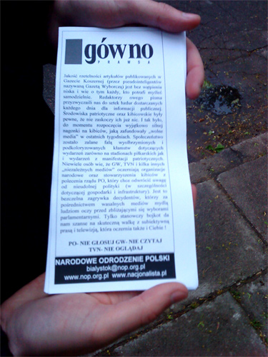 Przed meczem Jagiellonii Białystok z Legią Warszawa, pod stadionem białostoccy narodowcy z NOPu rozdali około 1500 ulotek z hasłem „Gówno Prawda”. Treść ulotki informowała o nagonce Gazety Wyborczej i TVNu na środowiska kibicowskie i nacjonalistyczne. Oprócz tego NOPowcy zachęcali do bojkotu tych mediów, które z polecenia decydentów odwracają uwagę społeczeństwa od nieudolnej polityki rządu Tuska. Akcja cieszyła się ogromnym poparciem kibiców.