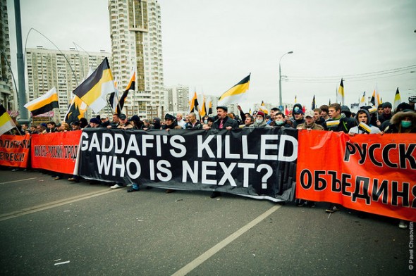 Podczas manifestacji wznoszono hasła skierowane przeciw imigrantom z Kaukazu, oraz przeciw rządzącemu Rosją tandemowi Putin-Miedwiediew, lecz także te odwołujące się do dawnego carskiego Imperium. Wśród licznych transparentów pojawił się także baner o treści „Kaddafi zabity. Kto następny”. Sam Marsz przebiegł w spokoju, bez większych zakłóceń ze strony mili-policji, czy lewicowych bojówek.