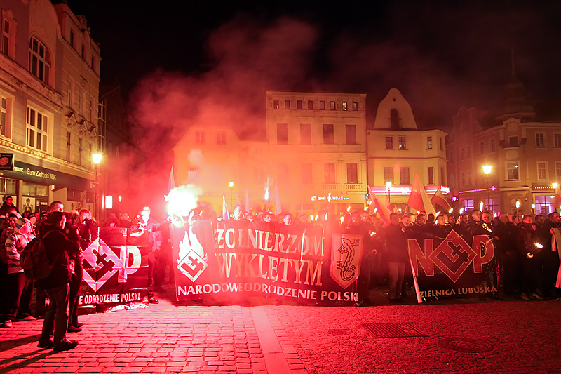 Następnie manifestacja ruszyła w blasku pochodni ulicami miasta, a jej uczestnicy wznosili okrzyki, które z wielka siłą odbijały się od murów żarskich kamienic: „Cześć i chwała bohaterom”, „Narodowe Siły Zbrojne”, „Bóg, honor i ojczyzna”, „Narodowy radykalizm”, „Nachodzą, nadchodzą nacjonaliści”, „Nie czerwona, nie tęczowa – tylko Polska Narodowa”, „Precz z Unia Europejską”, „Wczoraj Moskwa, dziś Bruksela – Polak żadnej nie wybiera’, „Nigdy więcej komunizmu” i inne.