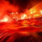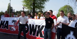W 221 Rocznice Uchwalenia Konstytucji 3 Maja o godzinie 10:45 ruszyliśmy w wyznaczone wcześniej miejsce zbiórki, gdzie łącznie stawiło nas się ok 40 osób. Następnie udaliśmy się pod Kościół, z pod którego miał rozpoczynać się cały pochód. Ku naszemu zdziwieniu, rozpoczynając marsz z hasłem na ustach: „Bóg , Honor i Ojczyzna”, ludzie bili nam brawo i gratulowali. Na przodzie grupy szliśmy z flagą narodową Hajnówki, która była szeroka na całą ulice. Mieliśmy również wspomnianą wcześniej flagę z krzyżem celtyckim, a nad naszymi głowami powiewało kilkanaście biało-czerwonych flag na kijach oraz szalików. Odpaliliśmy również race, które bardzo zaciekawiły najmłodszych uczestników marszu. Idąc główną ulicą dało się zauważyć nagłe zniknięcie flag Unii Europejskiej, które zapewne zerwał wiatr, przed którym dzień wcześniej ostrzegali synoptycy Cieszę się , że mogę napisać, iż wiele osób które uczestniczyły w marszu czy też po prostu znajdowały się w pobliżu niego, chętnie dołączało do naszej grupy i śpiewało razem z nami, a na ich twarzach malowało się zadowolenie, ale i cień zaskoczenia. Początkowo, nie ukrywamy… czuliśmy obawę przez tym jak zareagują mieszkańcy. W poprzednim roku również organizowaliśmy się na obchody, ale nie na taką skale. Była nas grupka jedynie kilkunastu osób, ale postanowiliśmy, że w następnym roku będzie nas więcej. Przez całą drogę marszu krzyczeliśmy również m.in. hasła: „Precz z Unią Europejską”, „Dumni z bycia Polakami”, Cześć i chwała bohaterom” . Wielu mieszkańców krzyczało razem z nami, ale znaleźli się również tacy, którzy bulwersowali się na hasła „Nadchodzą, nadchodzą nacjonaliści” czy też „Precz z komuną” , choć były to jednostki i staraliśmy się na nich nie zwracać uwagi. Kiedy dotarliśmy pod Obelisk w Parku Miejskim, gdzie miała odbyć się cała uroczystość, został odegrany Hymn Państwowy przez Orkiestrę Dętą, który wspólnie odśpiewaliśmy. Następnie Burmistrz Hajnówki wygłosił przemowę i pomodliliśmy się za Ojczyznę. Później złożyliśmy kwiaty jako Fan Club Jagiellonii Białystok z Hajnówki. Dostaliśmy ogromne brawa i słychać było wiele miłych słów pod naszym adresem, choć żeby nie było tak słodko, to przez fale braw przebiło się również stwierdzenie, że takich ludzi jak my trzeba się wystrzegać … Ale cóż… Każdego nie zadowolisz… Są tacy, którzy całą wiedzę opierają na Wyborczej, czy TVN24. Po uroczystości udaliśmy się pod zapomniany przez mieszkańców pobliski pomnik gdzie wbiliśmy flagę i kilkakrotnie krzyknęliśmy „Pamiętamy!”. Warto wspomnieć, że przez cały ten czas towarzyszyli nam jak zwykle niezawodni „tajni” fotoreporterzy z Policji, którzy za wszelką cenę chcieli mieć zdjęcie każdego z każdej strony.