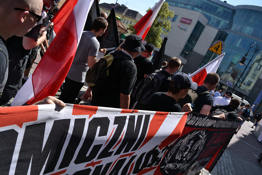 Chyba weszła już ustawa zakazująca zakrywania twarzy i przynoszenia środków pirotechnicznych(rac?). Ten gostek z szalikiem na twarzy mógł dać pretekst do rozwiązania przemarszu, organizatorzy powinni być bardziej czujni na takie rzeczy.