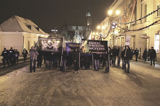 Około 150 osób wzięło udział w manifestacji zorganizowanej przez podlaską dzielnicę Narodowego Odrodzenia Polski. Okazją do manifestowania były przypadające dwie rocznice: 13 grudnia 1981 komuniści wprowadzili w Polsce stan wojenny, zaś 13 grudnia 2007 „prawicowy” prezydent Lech Kaczyński, z pełnym poparciem „lewicy” podpisał Traktat Lizboński likwidujący naszą niepodległość.