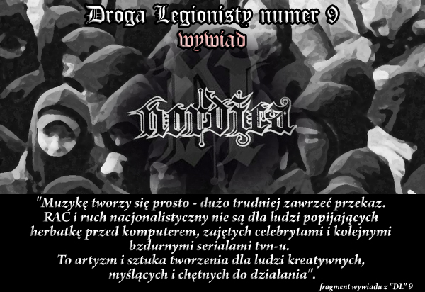 – „DL” 9 to aż cztery wywiady! Scenę rap reprezentują przedstawiciele warszawskiego podziemia, którym nie jest obca Legia i nacjonalizm: Napalm Grupa oraz Enceha! Muzykę rockową, oczywiście nurt nacjonalistyczny, reprezentuje znana i lubiana Nordica, która niedawno wydała krążek! Ostatni wywiad to konkretna rozmowa z grupą Ultras Zagłębie Sosnowiec! Kto zna Zagłębiaków ten wie, że reprezentują styl old school i czuć to w tej rozmowie. Gadaliśmy też o kontrowersjach takich jak słynne „Czerwone Zagłębie” i myślę, że pada tu odpowiedź pełna. Ogólnie mimo, że to grupa ultras – nie rozmawiamy zbyt dużo o kartonach i pasach materiału…