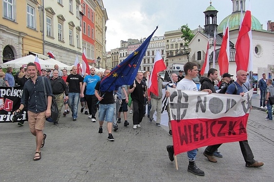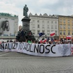 Wykrzykując hasła nacjonalistyczne, zwracając uwagę tłumnie zgromadzonym krakowianom na utratę wolności przez Polskę, manifestacja wróciła na Rynek, gdzie podsumowano 10 lat obecności w UE: