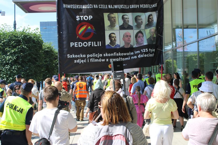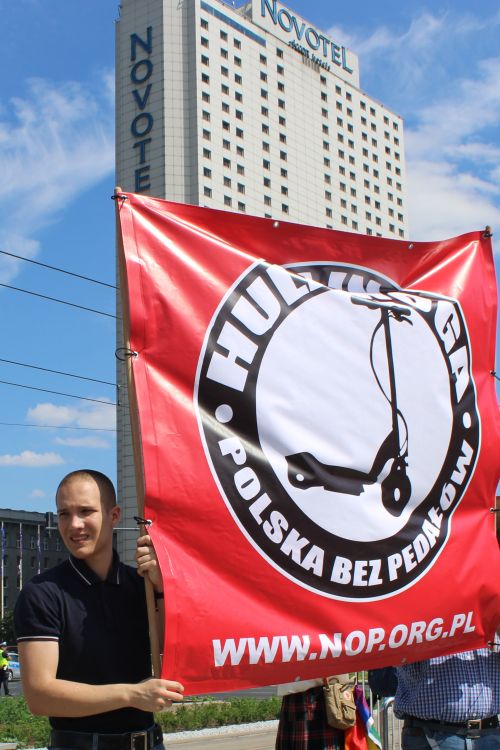 Tegoroczny zlot seksualnych degeneratów zwołany do Warszawy miał mieć charakter szczególny – jako połączona impreza dewiantów polskich i ukraińskich. Istotnie, dało się zauważyć potężne pieniądze wyłożone na imprezę (zwiększono liczbę platform z nagłośnieniem), jednakże to było wszystko – natury się nie oszuka, a depopulacyjny charakter sodomii sprawia, że wykazuje ona w liczbach tendencją spadkową. Kulturowo-społeczna ofensywa spedalania młodych pokoleń daje efekty póki co średnie – aczkolwiek propaganda i działania homoseksualnego lobby usiłują tuszować niedobory dewiantów budując medialną narrację o społecznej akceptacji degeneracji. W sukurs tej propagandzie idą oczywiście działania polityczne, metodami administracyjnymi i sądowymi usiłujące pozbawić Polaków prawa do normalności. Nic zatem dziwnego, że Rafał „Kakao” Trzaskowski w ostatniej chwili zakazał zorganizowania nopowskiego Antypedalaskiego Centrum Konsultacyjnego, które w ubiegłym roku podczas podobnego sabatu cieszyło się sporym zainteresowaniem. Idąc za ciosem, policja i służby miejskie zabezpieczyły i zamknęły dla warszawiaków nawet przystanki tramwajowe, znajdujące się „w niebezpiecznie bliskiej” odległości od przemarszu zboczeńców. To oczywiście w niczym nacjonalistom nie przeszkodziło. Jak to mówi ustawa, w spontanicznym działaniu grupa członków NOP zajęła jedno z tych odciętych miejsc na Rondzie Dmowskiego, radośnie i po polsku pozdrawiając chorych i biednych ludzi banerami z symbolami z dwóch autorskich kampanii NOP: „Zakaz Pedałowania” i „Hulajnoga. Polska bez pedałów”. Akcja spowodowała niemałą panikę wśród mundurowych, których wytyczne nie przewidywały dopuszczenia do sprzecznego z liberalną propagandą stanowiska Polaków. Nacjonaliści zostali wyparci pod Rotundę, skąd potem, wraz ze środowiskami pro-life, ruszyli marszem na Stare Miasto.